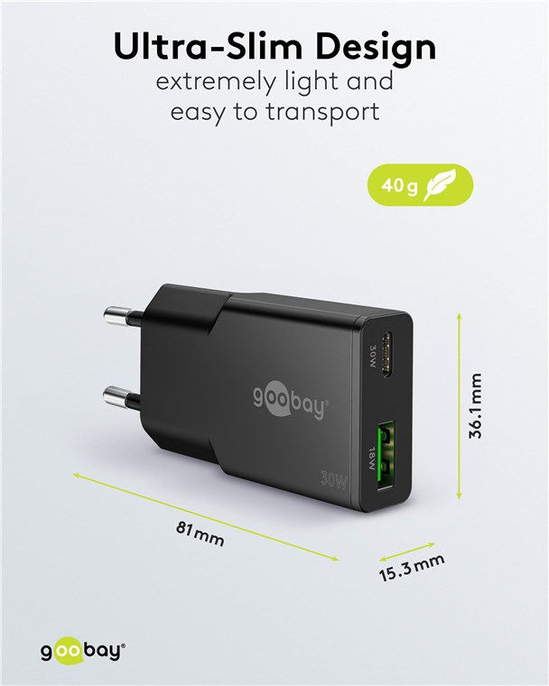 goobay 30W USB-C PD GaN duální rychlonabíječka tenká 1x USB-C™ port (Power Delivery) a 1x USB-A port (Quick Charge) černý