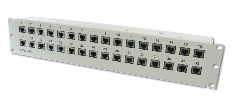 - 32x port RJ45 - Cat5e EIA/TIA 568 a ISO/IEC 11801. - šířka pásma až 100 MHz. - 1.2 mm tlustá ocel - stíněné RJ45 konektory, 8P8C - pro instalaci do 19" racku - 2U výška - instalace kabelů pomocí LSA nástroje - barevně rozlišené dle normy EIA/TIA 568 A & B - béžová barva