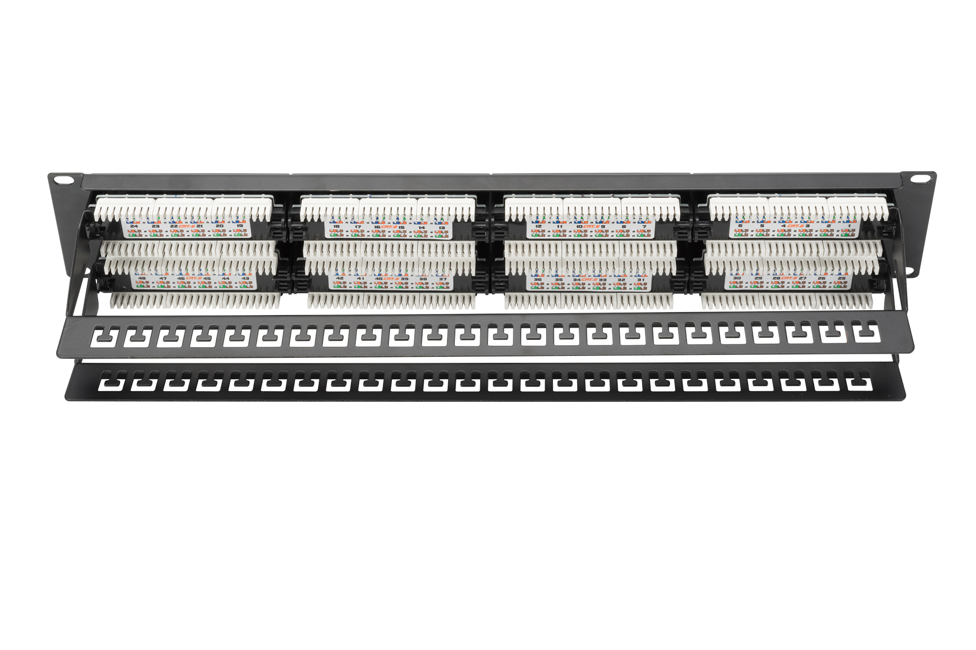 Patch panel CAT 6, nestíněný, 48 portů RJ45, 8P8C, LSA, 2U, montáž do racku, bl, 482x44x109 mm